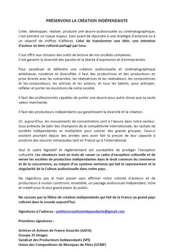PÉTITION : PRÉSERVONS LA CRÉATION INDÉPENDANTE