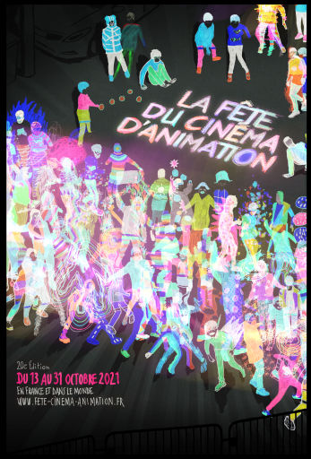 Chaque année, l'AFCA donne carte blanche au lauréat du prix Emile-Reynaud pour réaliser l'affiche de la Fête. Cette année c'est donc Bastien Dubois, réalisateur de Souvenir Souvenir, lauréat 2020 qui a conçu le visuel de cette nouvelle édition placée sous le signe de la fête et de la résistance.