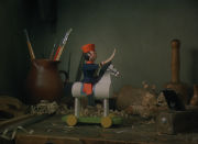 Dans son atelier, un ébéniste sculpte de petits personnages, hommes et animaux, qui cohabitent en harmonie. Mais dès qu’il a le dos tourné, une branche s’improvise fronde malicieuse et met le bazar parmi tous ces petits habitants, notamment un cavalier tout juste terminé…