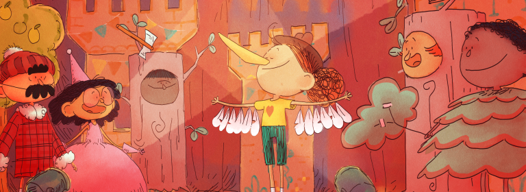 La Grande rêvasion de Rémi Durin (France, Belgique, 2025, 26') : Alors que le spectacle de l’école va commencer et que les applaudissements du public résonnent, Andréa n’ose pas rejoindre ses camarades sur scène. Pour se cacher, elle file s’enrouler dans une cape de fortune dont le tissu semble interminable. Elle en ressort finalement dans un magnifique palais, entouré d’un nuage aussi moelleux qu’impénétrable.